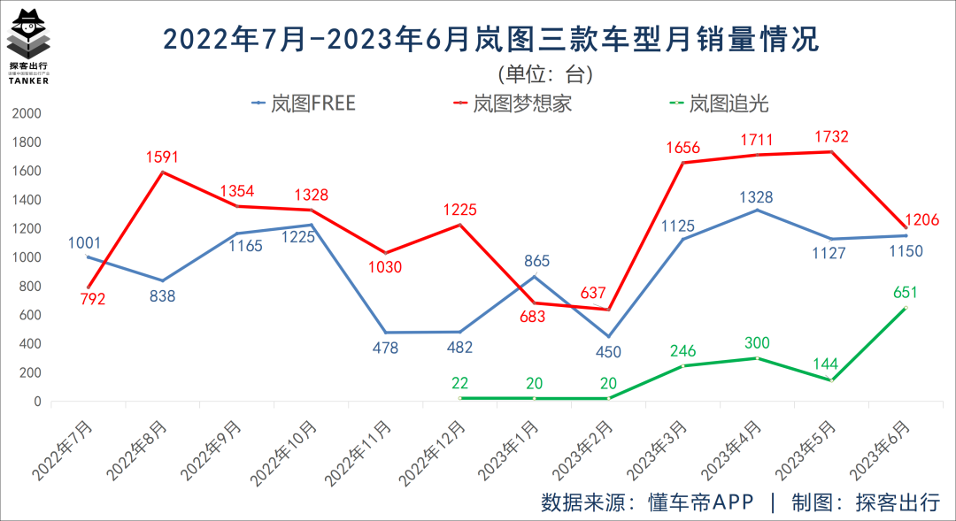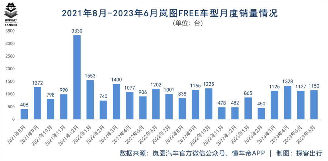 「探客出行」结合岚图官方微信公众号和懂车帝APP数据发现,岚图FREE从2021年8月开启交付以来,截至2023年6月的累计销量约2.49万台,平均月销不到1100台。