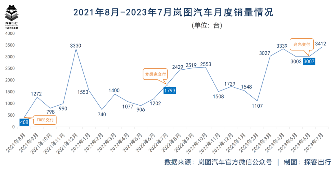 8月1日,岚图公布了最新销量数据,2023年7月岚图新车交付3412台,同比增长90.30%,环比增长13.47%,连续第五个月越过月销3000台关口。