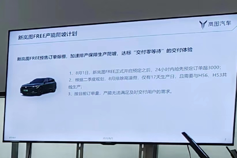 近日,一张疑似岚图内部的照片显示,全新岚图FREE自从8月1日开启预售以来,24小时内订单已经超过3000台。同时,因为8月的高温假和产线共用原因,新岚图FREE的产能或许无法跟上用户的需求。
