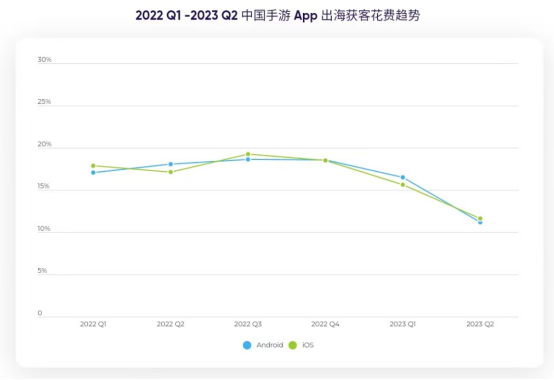 2023年Q1至Q2,安卓和IOS分别环比下滑17.78%和25.2%。随着安装量的整体下滑态势,广告主获客预算也呈现同步下滑。