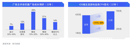此外2022年IOS端主流品类买量成本大多分布在200-700元之间,相较往年增长了11-43%。