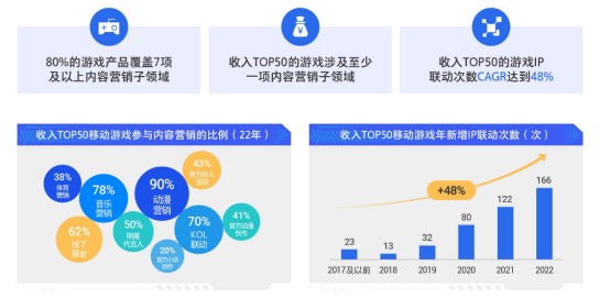 根据腾讯广告调研,80%游戏产品覆盖7项及以上内容营销子领域,收入TOP 50游戏至少涉及一项内容营销子领域。