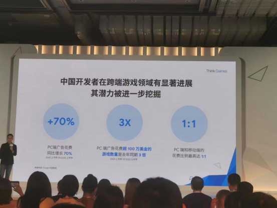 而谷歌在活动中分享了一些有趣的数据,PC端广告花费同比增长70%,超百万美金游戏数量是去年的三倍,最头部的游戏甚至达到了1比1的投放,预计今年多端同步的游戏也会是去年的三倍。