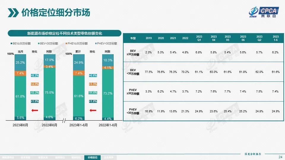 乘联会数据显示,售价大于等于30万的纯电及插混市场增速明显,纯电动方面,市占份额已经从2019年的2.3%,增至2023年1-6月的6.2%,这也给了比亚迪旗下高端车增长的机会。