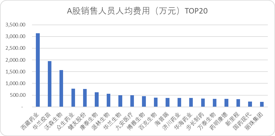 销售人员人均销售费用,西藏药业以3100万以上独占鳌头,排名前20的企业年均销售人员平均花费均超过了200万。A股所有医药企业,销售人员人均费用平均数为159万元。