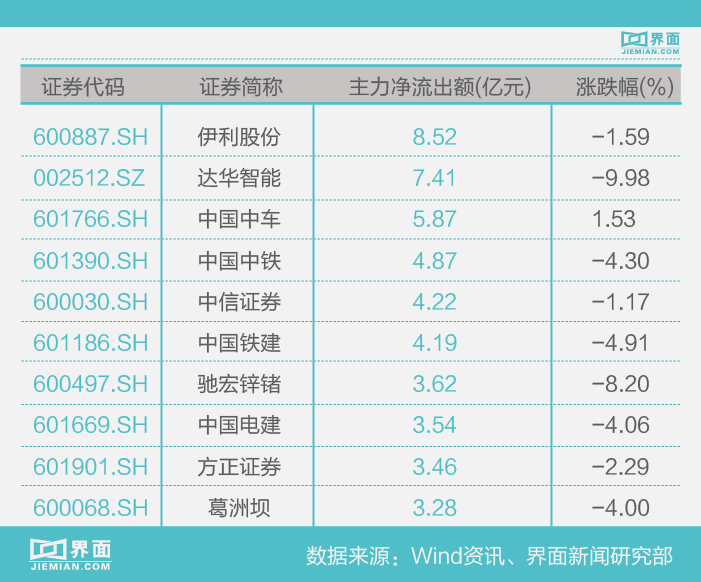 伊利股份(600887.SH)、达华智能(002512.SZ)、中国中车(601766.SH)的主力净流出资金量居今日两市个股前列,其净流出资金额分别为8.52亿元、7.41亿元、5.87亿元。继昨日集体飙升后,中字头股今日却迎来一波明显的回调,导致严重缩量。中国中铁(601390.SH)、中信证券(600030.SH)、中国铁建(601186.SH)以及中国电建(601669.SH)今日主力净流出额较高,分别为4.87亿元、4.22亿元、4.19亿元以及3.54亿元。