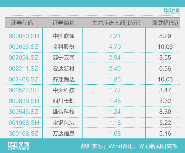 个股资金数据显示,中国联通(600050.SH)、金科股份(000656.SZ)、苏宁云商(002024.SZ)领衔成为今日十大主力资金重点抢筹的对象。上述三只个股的主力净流入额分别为7.21亿元、4.79亿元、2.94亿元。中国联通今日报收6.66元,涨幅8.29%。其盘中股价一度触及涨停,并创下年内新高。导致该股今日大热的原因无疑是有关集团混改方案的消息被热传,据悉三大互联网巨头百度、腾讯和阿里巴巴都会参与联通集团的混改,但各家持股比例不同。对此。联通方面回复表示还未确定。本月,联通A股涨幅高达29.82%,远远跑赢大盘。