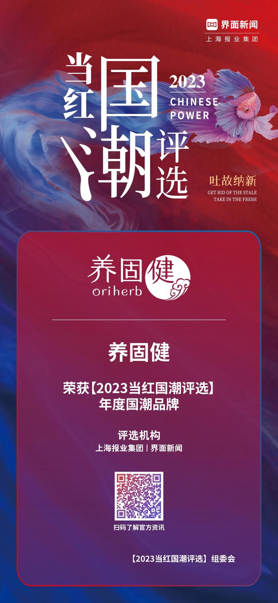 养固健,从中草药经典方剂中汲取智慧与启示,展现了传承东方底蕴、又不乏现代简约的新中式表达,成功将中华养生模式的推广提升到了全新高度。当之无愧荣获【2023当红国潮评选】年度国潮品牌。