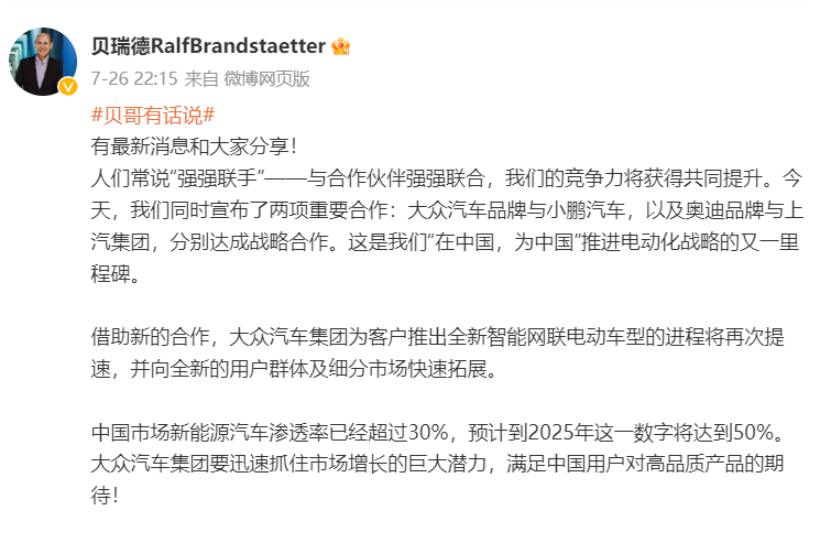 合作后,大众可以更深入地了解中国新能源汽车市场,融入中国新能源汽车生态,了解中国消费者的需求,小鹏来自中国,对中国的交通特点、中国用户的驾驶习惯,用车习惯等都有更深刻的认知。大众汽车集团负责中国区业务的管理董事贝瑞德(Ralf Brandst tter)表示:“与本土伙伴的合作是我们‘在中国,为中国’战略的重要基石。”