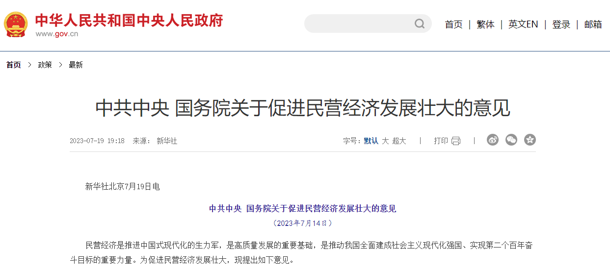 7月19日,中共中央、国务院发布《关于促进民营经济发展壮大的意见》(以下简称《意见》)。其中,《意见》要求强化民营经济发展法治保障,健全对各类所有制经济平等保护的法治环境,为民营经济发展营造良好稳定的预期。