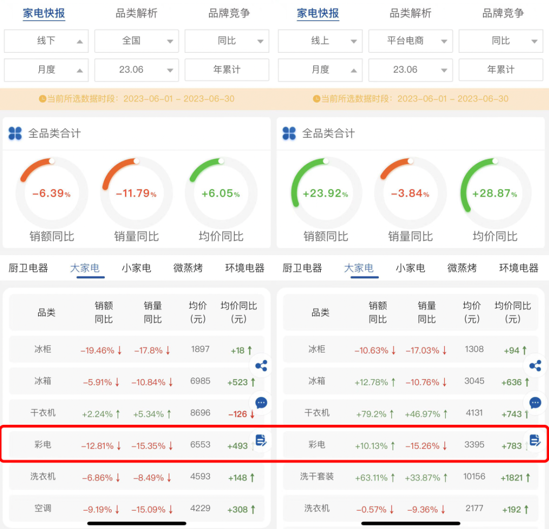 奥维云网数据显示,2023年3至5月份,国内彩电线上、线下渠道均价同比上涨,其中线下渠道均价分别上涨165元、225元、315元。618大促活动过后,电视市场掀起的涨价潮更为明显,根据奥维云网数据罗盘,2023年6月,线上彩电均价同比上涨了783元,线下彩电均价同比上涨493元。