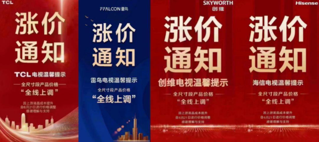 康佳在6月21日上调全尺寸段产品价格,康佳方面表示,本次价格上调幅度超过15%;长虹也在同期宣布,6月21日起电视全线在售产品上调10%~30%;TCL、创维、海信等品牌也陆续发布公告,宣布对旗下电视产品进行价格调整,价格涨幅普遍在 15%左右,最高涨幅达到30%。