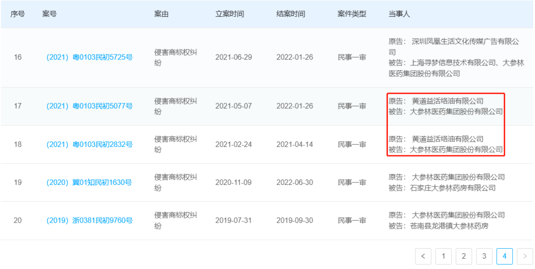 结合两案诉讼信息,大参林大抵是销售了其余两被告生产的涉嫌侵权的活络油产品,被卷入侵权纷争。其实这已经不是大参林与香港黄道益的第一次纠纷,2021年2月香港黄道益就曾起诉大参林商标侵权,2个月后撤诉;随后又于2021年5月发起商标侵权诉讼(请求金额200-250万),此案于2022年1月以调解方式结案。