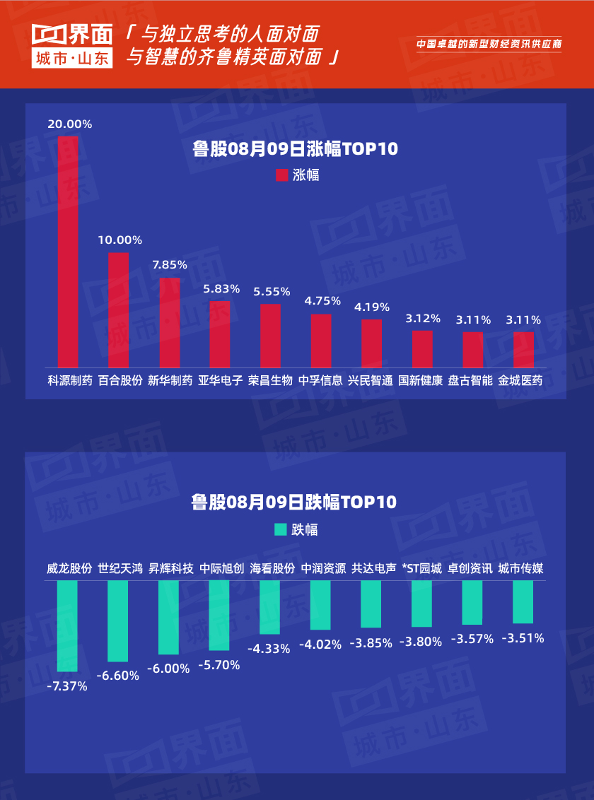 8月9日,山东省内沪深股票有65只个股上涨,231只个股下跌;总市值过千亿的有万华化学(600309)、海尔智家(600690)、兖矿能源(600188)、青岛啤酒(600600)、中航沈飞(600760)、中际旭创(300308)、潍柴动力(000338)、山东黄金(600547)共8家,500亿-1000亿的共有5家,分别是华鲁恒升(600426)、歌尔股份(002241)、浪潮信息(000977)、华电国际(600027)、中泰证券(600918)。截至收盘个股股价最高为中际旭创(300308),收于126.84元;最低为山东钢铁(600022),收于1.55元。