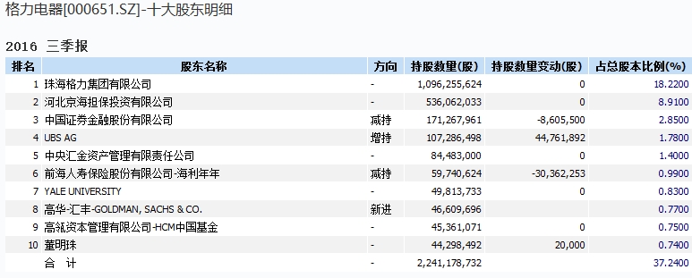 2016年三季报显示,格力电器前三大股东分别为珠海格力集团有限公司、河北京海担保投资有限公司、中国证券金融股份有限公司,持股比例为18.22%、8.91%、2.85%。