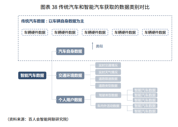 汽车数据数量巨大。据车百智库、智能汽车与智慧城市协同发展联盟合作的研报《智能网联汽车发展若干重大问题》,一辆 L4 自动驾驶的智能网联汽车,每日通过车内外传感器采集的行驶数据、环境数据和行为翻据等,已达到 10TB的量级,是传统汽车的 5-10 倍。