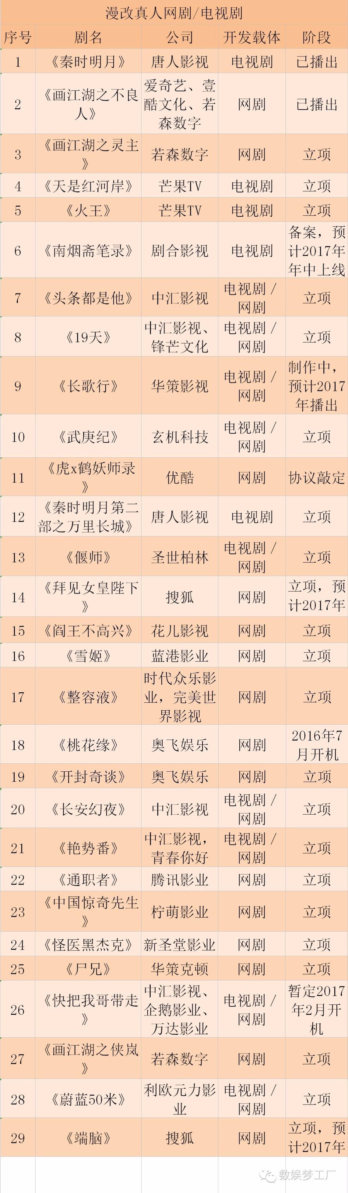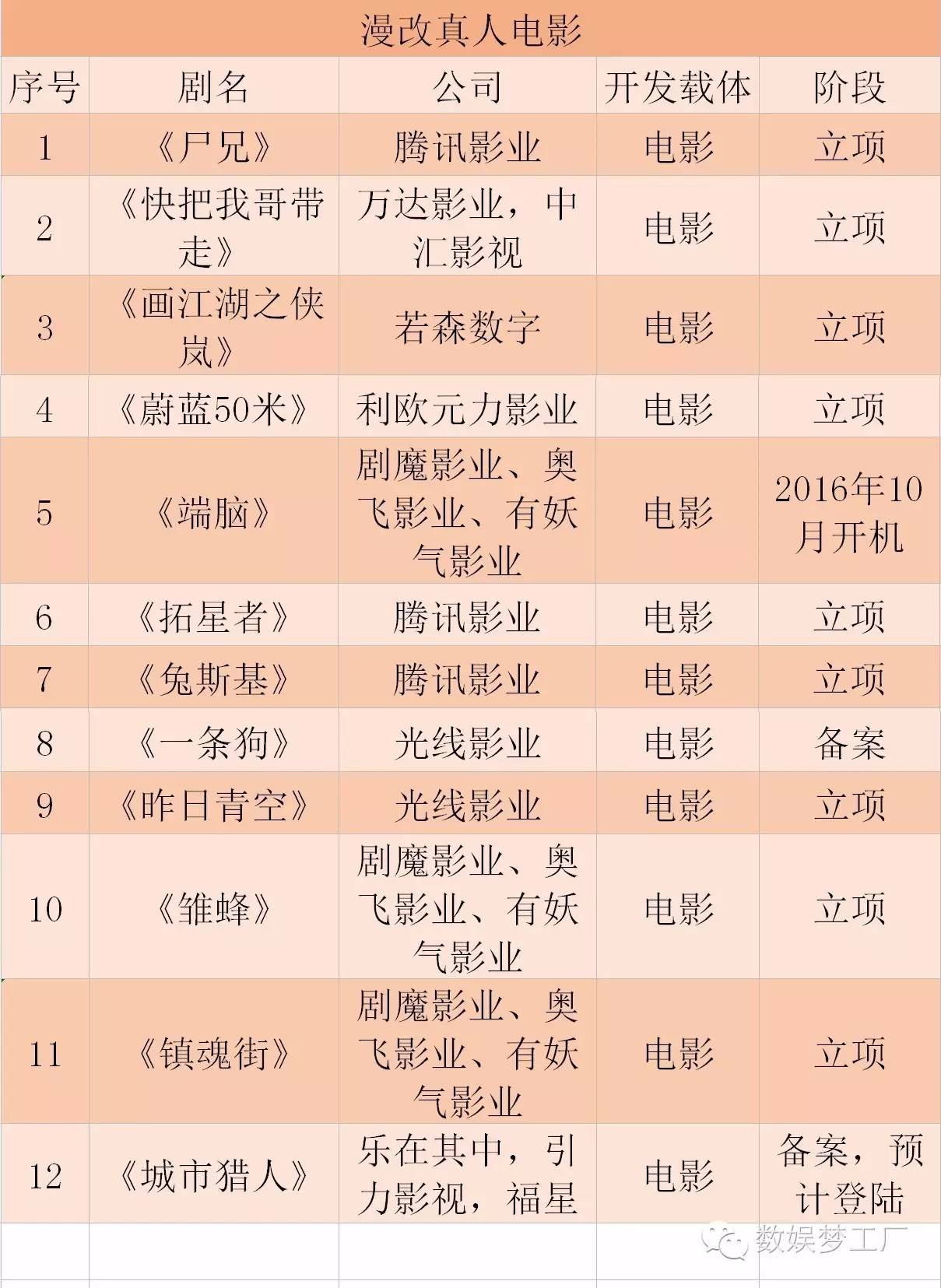 在目前签约开发的41个漫改真人项目中,有29部敲定了影视剧的开发计划,而计划开发的电影项目则有12部,分别是《拓星者》,《兔斯基》,《尸兄》,《一条狗》,《蔚蓝50米》,《昨日青空》,《快把我哥带走》,《端脑》,《雏蜂》,《镇魂街》,《画江湖之侠岚》和《城市猎人》。