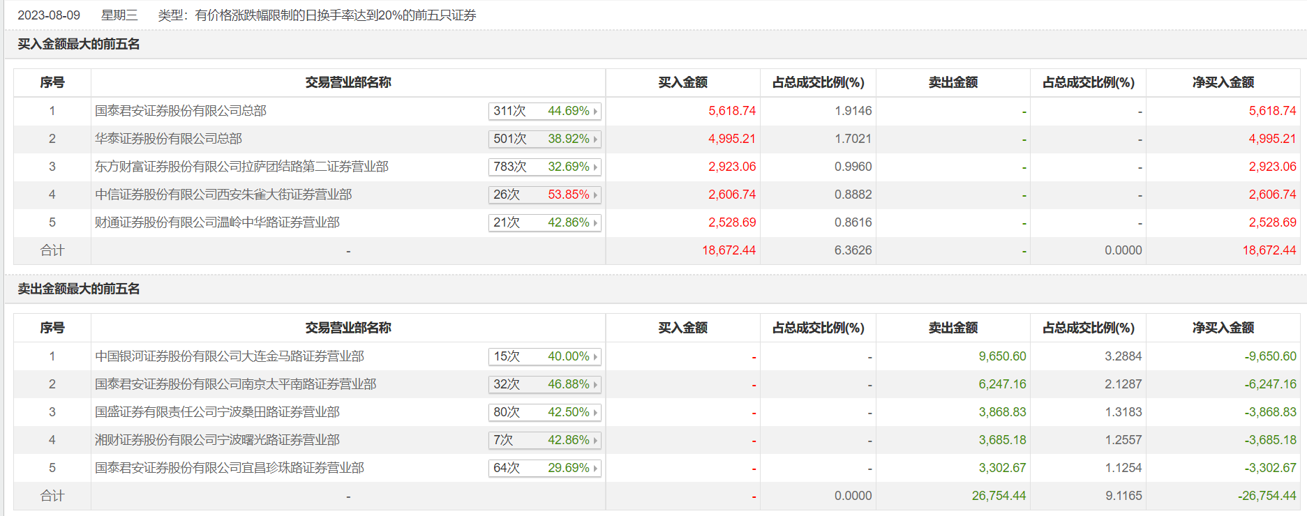 具体来看,知名游资现身龙虎榜,国泰君安证券总部、华泰证券总部分别买入5618.74万元、4995.21万元;中国银河证券大连金马路证券营业部、作手新一(国泰君安证券南京太平南路证券营业部)分别卖出9650.60万元、6247.16万元。