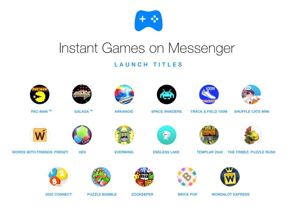 近日消息,Facebook推出一项新产品:Instant Games,该产品允许用户使用聊天软件Facebook Messenger玩游戏。此功能将通过app更新在全球30个国家推出,并且包含《吃豆人》,《太空入侵者》,《小蜜蜂》以及《动物园管理员》等总计17款经典游戏。