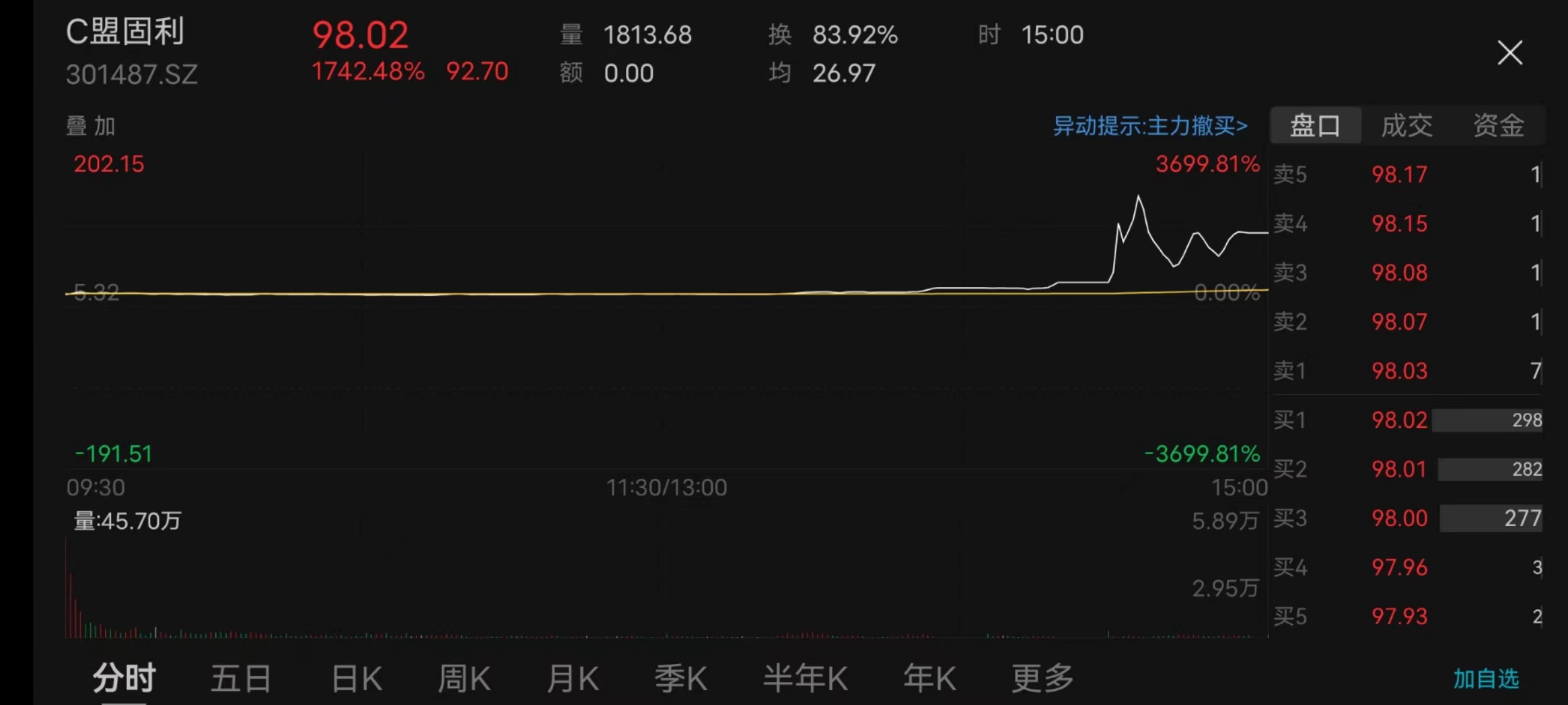 昨日,天津国安盟固利新材料科技股份有限公司(301487.SZ,下称盟固利)在深交所创业板正式上市,发行价为5.32元/股,盘中一度上涨近37倍,最高至202.15元。