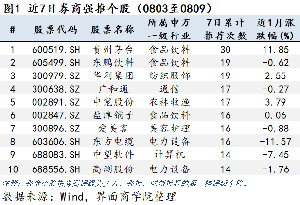 上图将券商近7日(8月3日至8月9日)推荐的个股按被推荐次数由高到低排序。共有10只个股得到券商一周之内推荐14 次以上,12只个股被推荐10次以上。