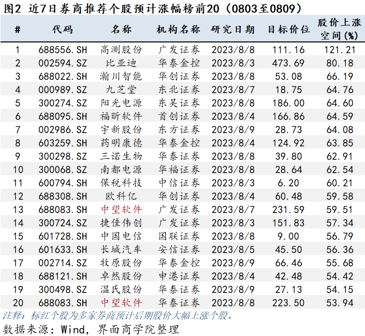 上图将券商近7日(8月3日至8月9日)推推荐的个股按预期股价上涨空间由高到低排序,股价上涨空间计算基数均以最新交易日收盘价为准,其中券商目标价通常指未来3至6个月券商预测目标价。其中,广发证券预测高测股份股价后续上涨空间为121.21%。