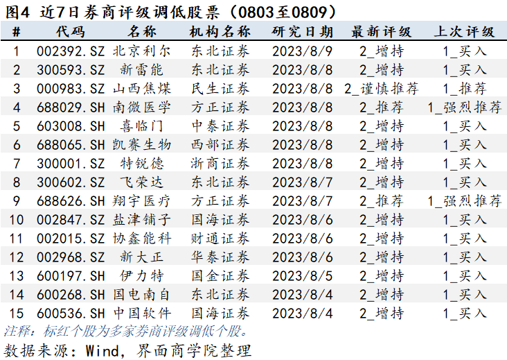 上图为券商个股在过去一周的评级下调情况。近7日共有15篇研报对15家A股公司评级进行下调。