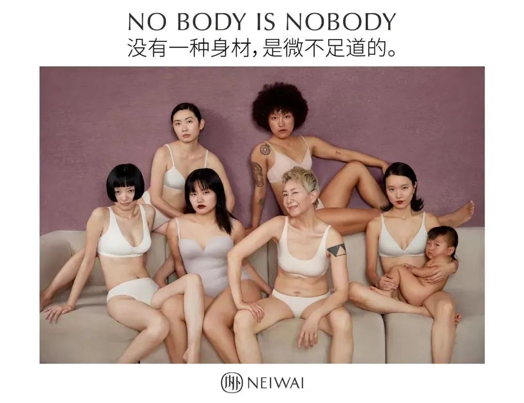 2020 年,NEIWAI内外发布了一部主题为 “NO BODY IS NOBODY”的春夏大片,并延续了三年。这个项目当时在营销圈引发了大规模讨论 ,至今仍被人津津乐道,原因在于它打破了人们对内衣广告的固有印象,让一群肥胖、平胸、年老、有疤痕的普通人来做模特,借此表达“没有一种身材,是微不足道的”,鼓励女性接纳自我。
