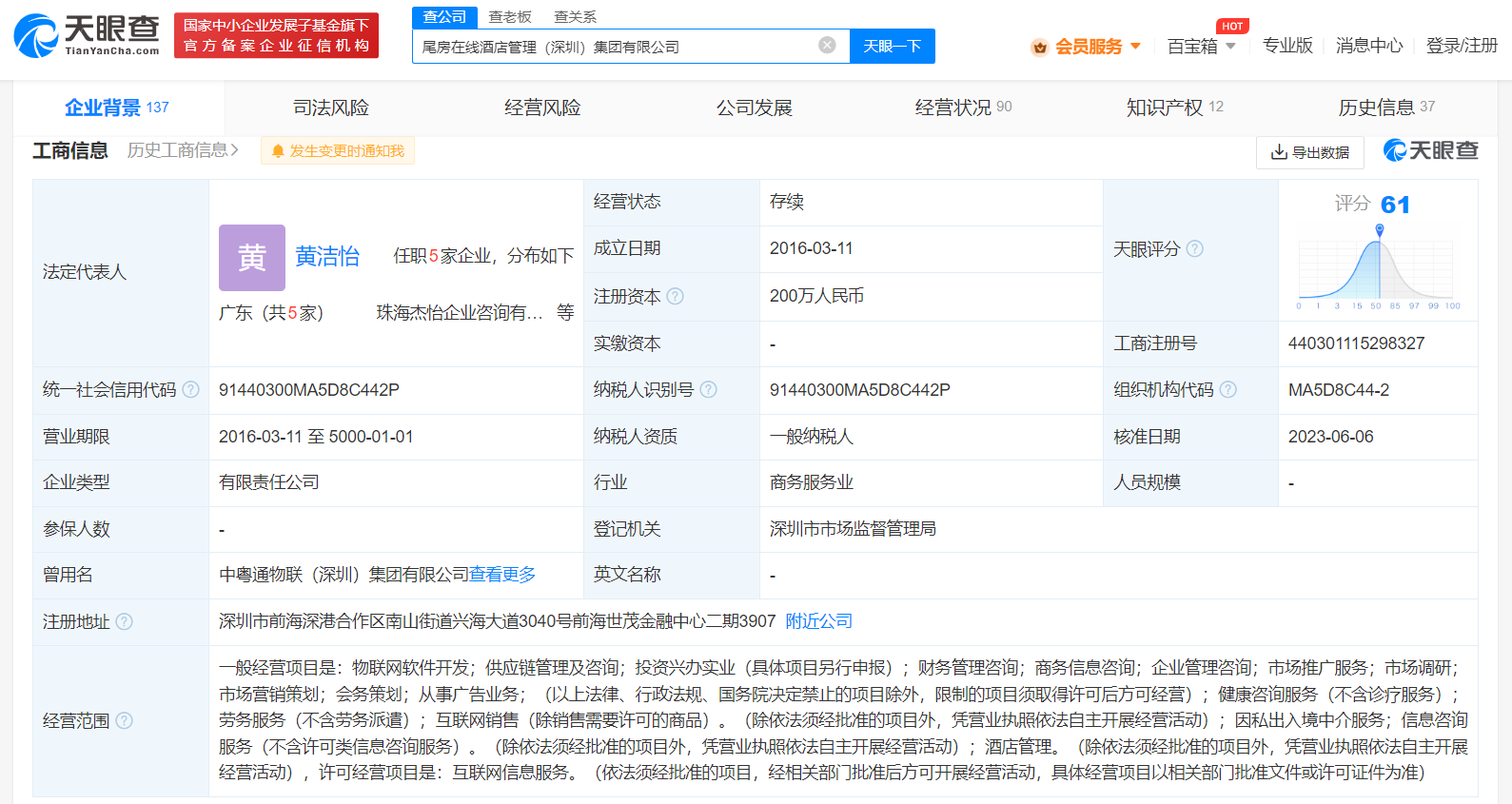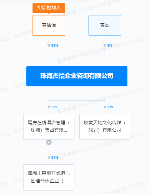 从公开信息可以看到,尾房在线酒店管理(深圳)集团有限公司,及大股东珠海杰怡企业咨询有限公司的法人、实际控制人均为黄洁怡,与港股上市公司德斯控股(08437)存在关联。德斯控股于今年4月3日起停牌至今,当前股价0.103港币,总市值1.37亿。