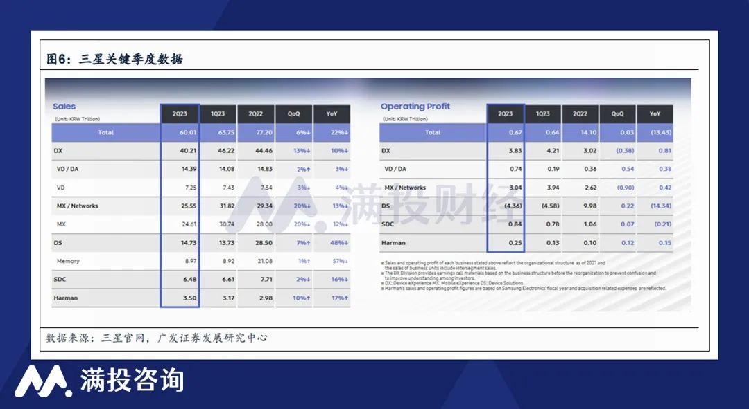 从具体收入情况来看,三星档期综合收入为60万亿韩元(约为455亿美元,韩元/美元汇率为1:0.0008),同比下跌22.2%,环比下降5.9%;营业利润为0.67万亿韩元,同比下跌95.2%,环比5%,较上一季度有所增加;净利润1.7万亿韩元,同比-85%,环比9.5%;毛利率30.6%,同比-9.5%,环比2.8%。整体而言,三星依旧处在弱景气区间,只是其跌幅相较一季度而言有所好转。