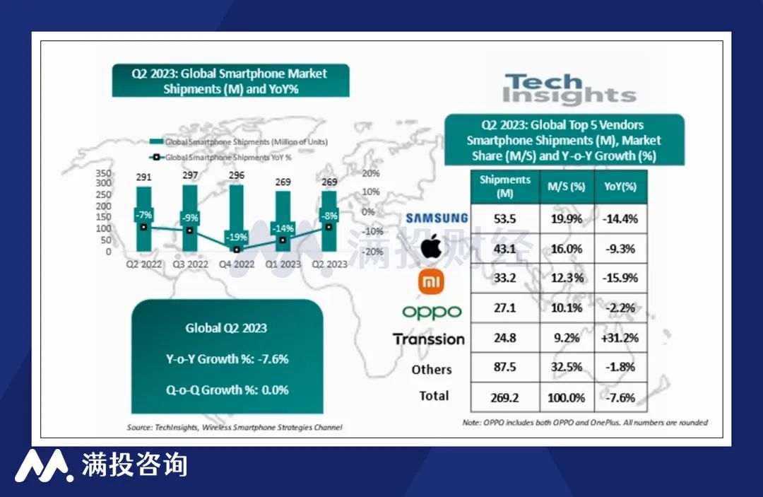 据Technology最新研究报告显示,2023年第二季度,全球智能手机出货量同比下降8%,环比下降5%,连续八季度出现同比下降,市场需求持续处于低迷状态。其中,三星的出货量5350万部,同比下跌14%,以接近20%的市场份额位居全球智能手机市场之首。