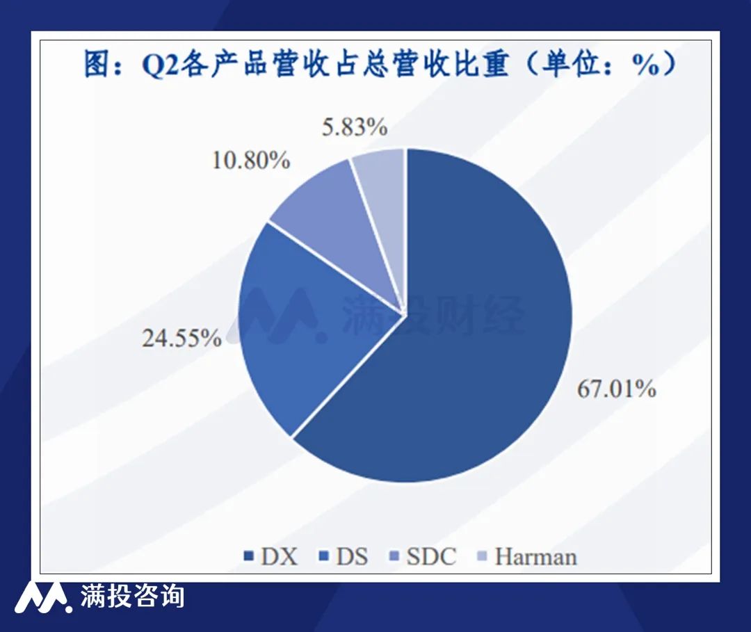三星的收入来源分为四部分。DX(智能手机和数字电器设备)部门收入为40.21万亿韩元,同比下降10%;DS(设备解决方案)部门收入为14.73万亿韩元,同比下降48%;SDC(显示)部门收入为6.48万亿韩元,同比下降16%;哈曼事业部收入3.50万亿韩元,同比增长17%。