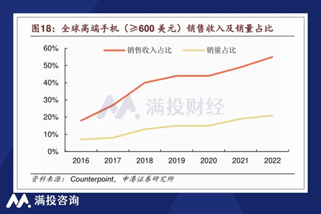 在存量市场不足的背景下,高端机型是智能机市场中较为坚挺的部分。根据IDC报告数据,,第二季度国内600美元以上高端手机市场份额达到23.1%,相比2022年同期逆势增长,增长3.1个百分点。在智能手机同质化严重的背景下,三星、苹果能够持续维持市场前列,同样是得益于高端机的布局。