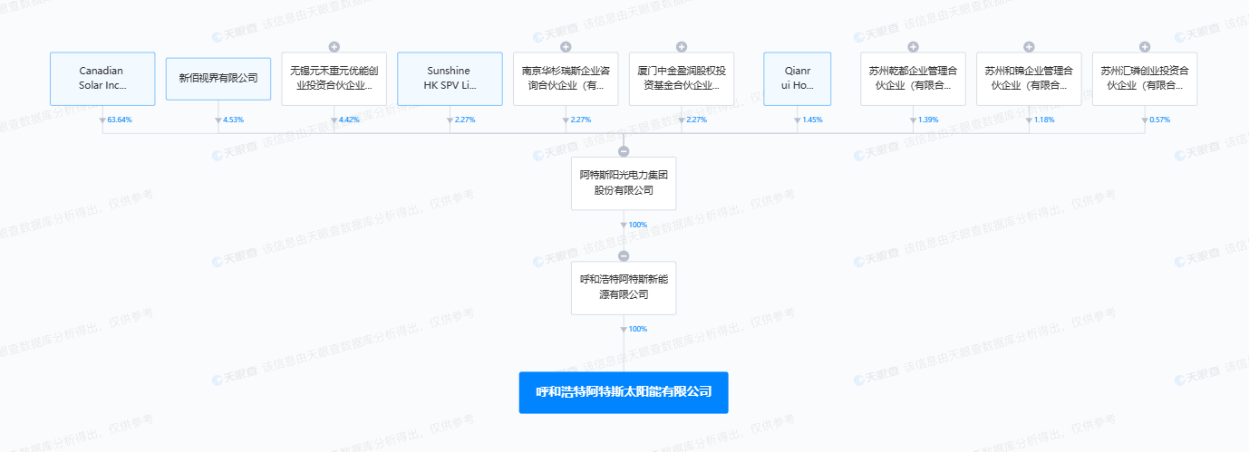 天眼查显示,近日,呼和浩特阿特斯太阳能有限公司成立,注册资本3亿元,经营范围包含:光伏设备及元器件制造;光伏设备及元器件销售等。该公司由阿特斯间接全资持股。