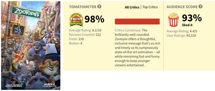 烂番茄新鲜度98%,跟年初的《疯狂动物城》持平。