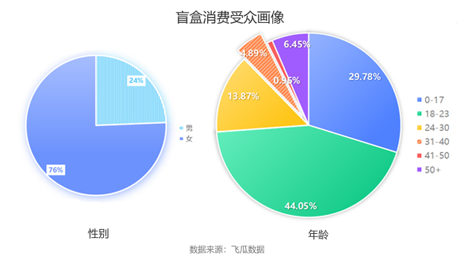 要说盲盒吸引消费者的地方,当然是其“刺激性”。盲盒消费收益反馈机制的不确定性是盲盒玩家上瘾的重要手段,利用消费者赌徒心理和依赖性。据统计,盲盒的消费群体中0-23岁占比73.83%,年轻化特征明显。