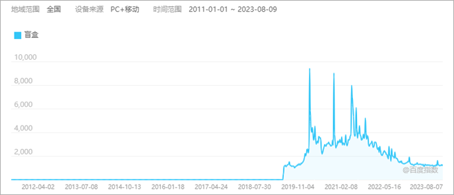 盲盒的火热是从数据层面上看是从2019年开始的。百度指数2019年底到2022年初为盲盒搜索指数高峰期,之后便有下降的趋势。当人们对盲盒的关注日渐降低,也预示着盲盒经济也开始走向下坡路。