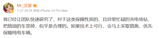 蔚来副总裁沈斐也曾发微博表示,要在技术上禁止烧油的车使用蔚来的补能站,优先保障纯电车辆。