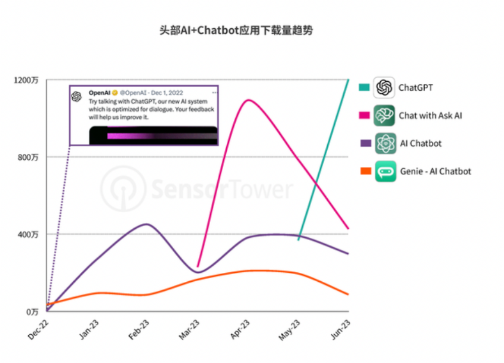 移动端的生成式AI应用,正处于激烈的竞争当中。根据SensorTower发布的《2023 年 AI 应用市场洞察》报告,随着2022年12月初ChatGPT的发布,Al+Chatbot赛道迅速升温。2023年上半年,市场中AI+Chatbot应用数量多达200余款,下载量突破1.7亿次,竞争十分激烈。