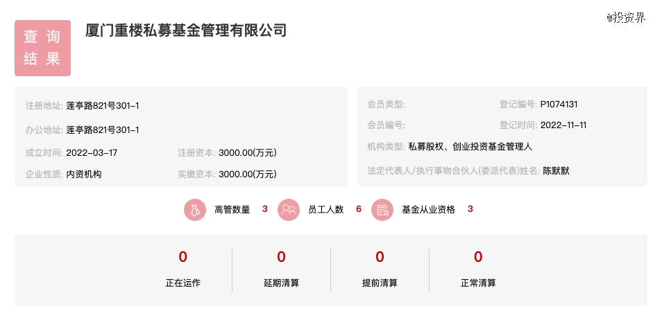 中国证券投资基金业协会官网显示,厦门重楼私募基金管理有限公司注册成立于2022年3月,登记时间为同年11月,实缴资本3000万元。机构经营范围包含:私募股权投资基金管理、创业投资基金管理服务等等。