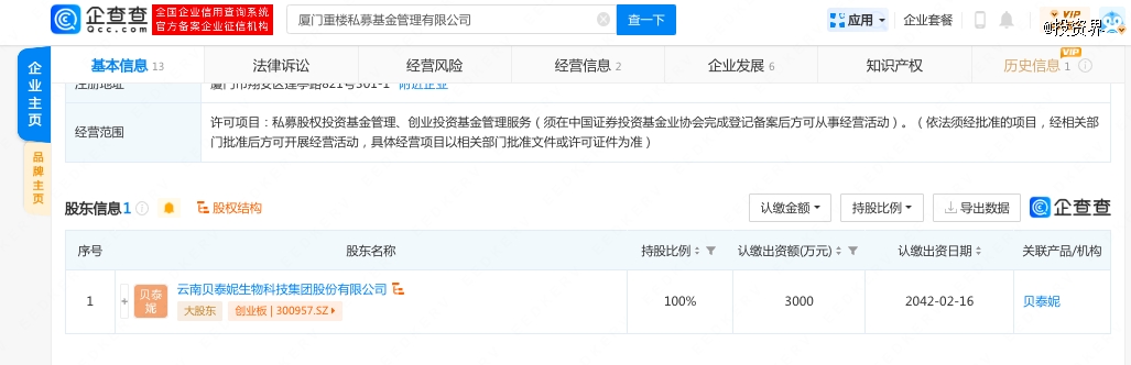 穿透厦门重楼私募基金管理有限公司,贝泰妮的身影浮现。企查查APP显示,该基金主体由贝泰妮100%控股。换言之,贝泰妮全资成立了一家私募基金,以VC机构的身份出现。