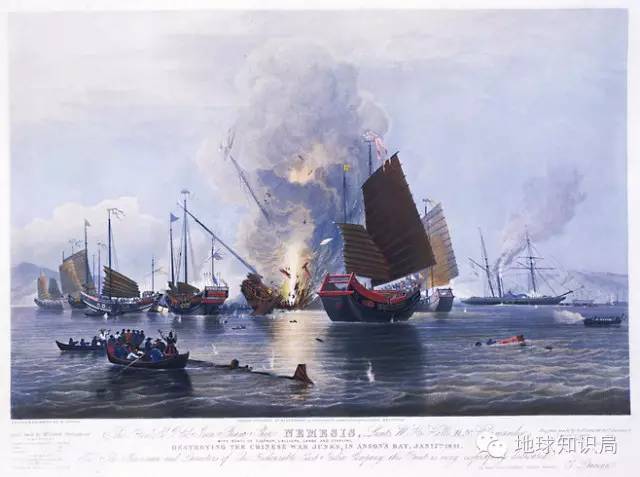 1841年鸦片战争虎门之战期间,英国复仇女神号(最右后方)战舰击毁一艘清朝戎克船。
