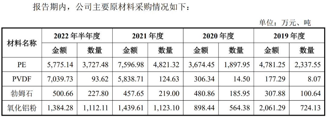 为什么说恩捷股份的出手直奔要害?仔细读一遍金力股份的招股书,答案会很清晰。2022年H1金力股份采购的主要原材料: