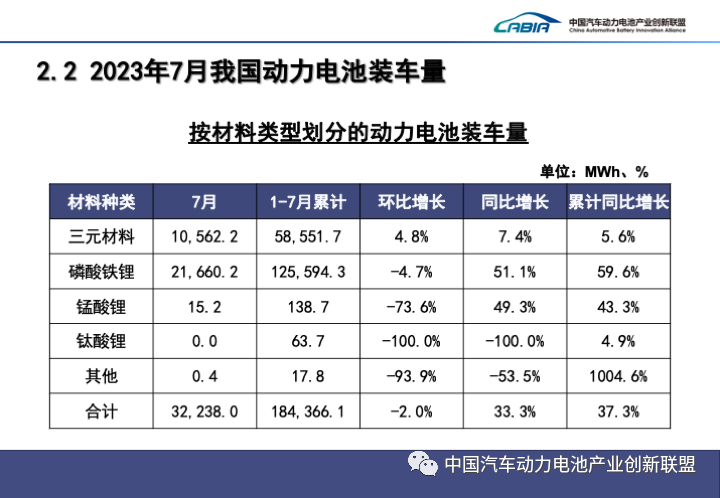 7月,国内动力电池累计装车量为32.2 GWh,同比增长33.3%,环比下降2%。