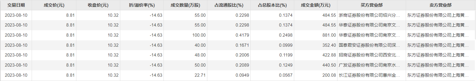 上海艾录8月10日大宗交易成交370.71万股,成交额3265.96万元,占当日总成交额的48.1%,成交价8.81元,较市场收盘价10.32元折价14.63%。