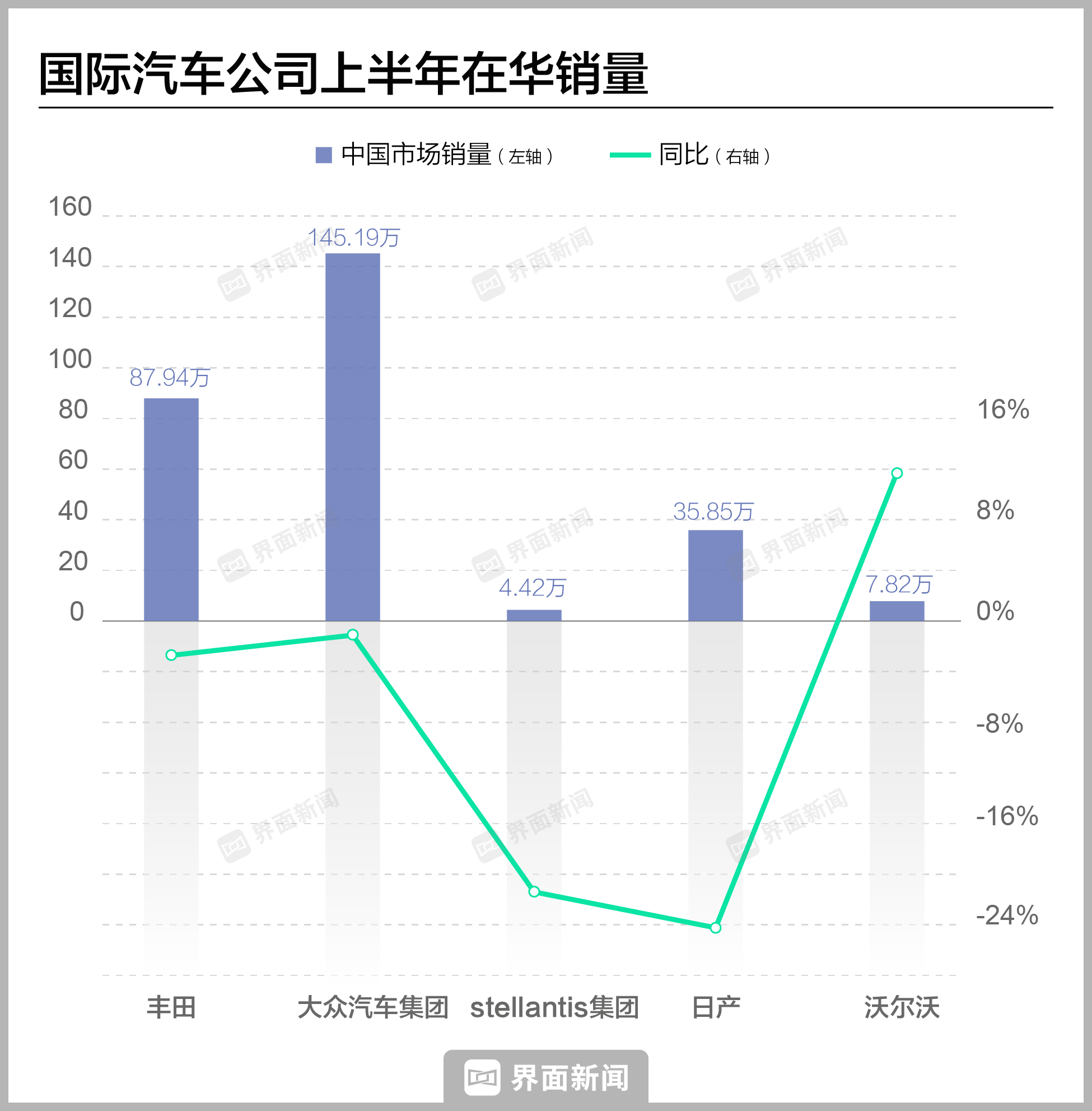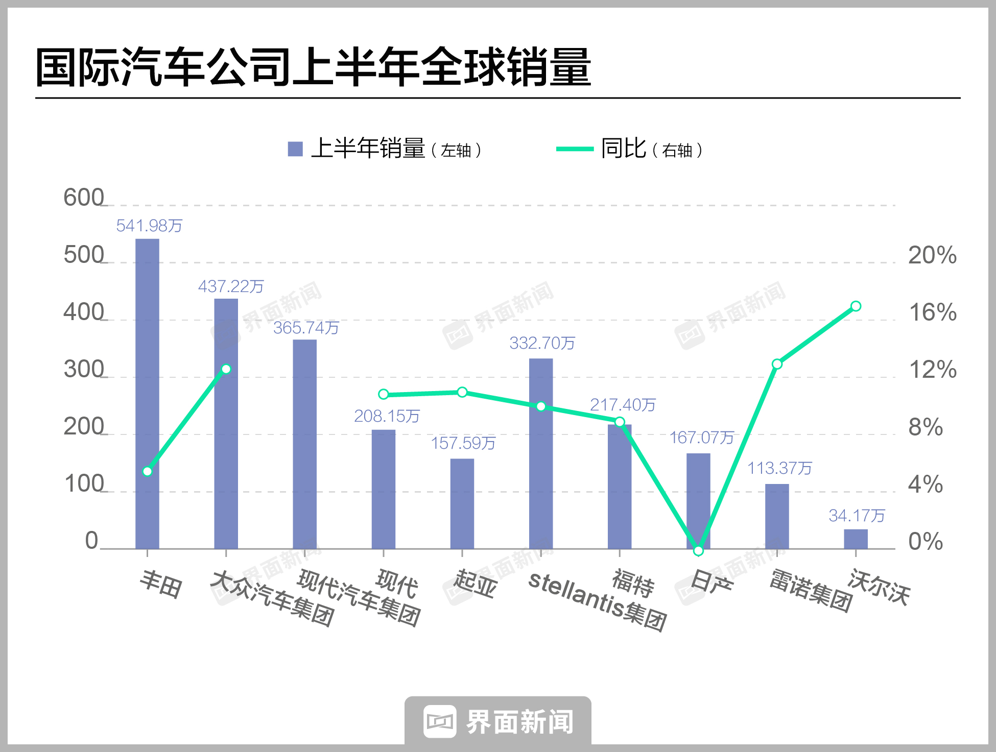 另外,stellantis集团销量332.7万辆,同比上升10%;福特上半年销量217.4万辆,同比上升9%。