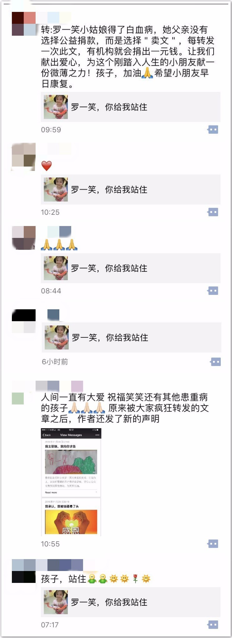第二个细节,今天早上很多朋友刷屏转发《罗一笑,你给我站住》时,加了这样一句话“每转发一次,就会有机构捐一块钱”。