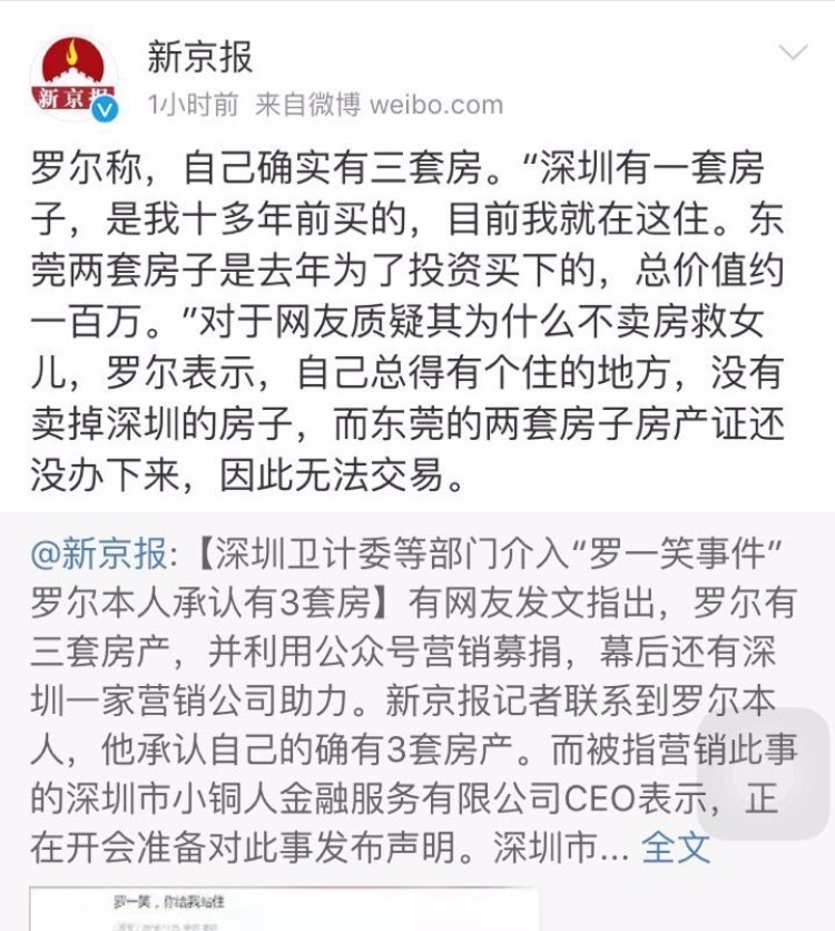 第一个跳出来的,是罗尔身边一些略知内情的人。他们透出了罗尔在深圳有一套房、在东莞有两套房的消息,也扔出了质疑,罗尔不是穷人,为什么先向大家伸手。此后,罗尔也向媒体确认,他有三套房,不过在东莞的两套房,房产证还没办好,没有办法交易。