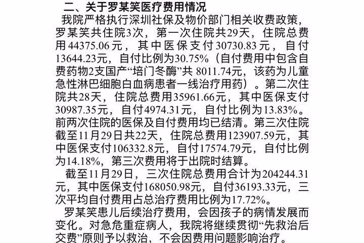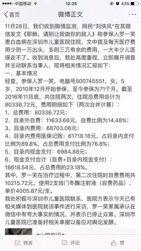有大V扔出了一个据说是深圳社保部门的回应,罗一笑住了两次院,一共花了8万多块钱,自费比例14.48%。
