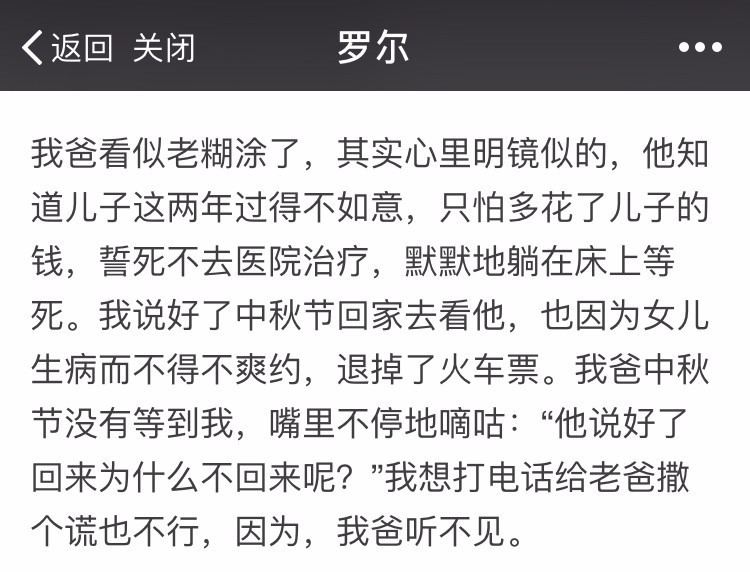 第一,按照罗尔的文章提供的信息,他的父亲病重,怕他花钱,誓死不去医院,只愿在家等死。这么说很残酷,可是罗尔是否用爱罗一笑的那份心力,去爱他的父亲了?